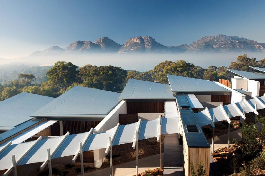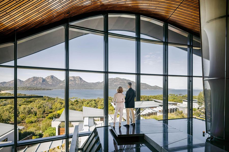 Saffire Freycinet to hotel, którego lokalizacja już na wstępie nadaje pobytowi wyjątkowy charakter. Obiekt położony jest na wschodnim wybrzeżu Tasmanii, na skraju Freycinet National Park, z widokiem na zatokę Great Oyster Bay i charakterystyczne granitowe szczyty pasma Hazards. To jedno z tych miejsc, gdzie architektura została zaprojektowana tak, by stapiać się z krajobrazem – niska zabudowa, naturalne materiały i panoramiczne przeszklenia sprawiają, że natura pozostaje nieustannie obecna. Jednocześnie hotel oferuje łatwy dostęp do jednej z największych ikon Tasmanii – Wineglass Bay.