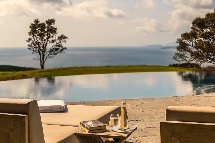 Całą posiadłość okala naturalny krajobraz Hawke’s Bay – od farmy owiec, przez klifowe wzgórza, po malownicze wybrzeże – co sprawia, że już sam spacer po okolicy jest doświadczeniem pełnym uroku. Hotel charakteryzuje się połączeniem surowej, naturalnej scenerii z wyrafinowaną elegancją: w centralnych salonach i przestrzeniach wspólnych dominuje ciepłe drewno, miękkie tkaniny oraz panoramiczne okna, które zapraszają naturę do wnętrza, a jednocześnie oferują wygodę i luksus najwyższej klasy.