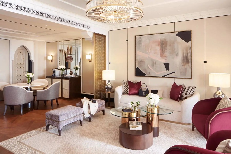 Hotel składa się z czterech niezależnych części, z których każda oferuje inny charakter pobytu. The Palace to najbardziej reprezentacyjna i klasyczna część kompleksu – monumentalna, utrzymana w pałacowej estetyce, z bezpośrednim dostępem do plaży, basenów i ogrodów. To tu znajdują się eleganckie pokoje i apartamenty z balkonami i tarasami, często z widokiem na morze, urządzone w stylu arabskim, z bogatymi tkaninami, ręcznie zdobionymi detalami i marmurowymi łazienkami. Arabian Court to część inspirowana tradycyjną architekturą Bliskiego Wschodu, z wewnętrznymi dziedzińcami, kolumnadami i nastrojowymi przejściami między ogrodami a basenami. Panuje tu bardziej butikowa, kameralna atmosfera, idealna dla osób ceniących styl i intymność. The Residence to najbardziej ekskluzywna i spokojna część resortu, przeznaczona wyłącznie dla dorosłych Gości. To tutaj znajduje się strefa ciszy, prywatny basen, wydzielone ogrody oraz rozbudowane spa, co czyni tę część idealnym wyborem na romantyczny wyjazd lub luksusowy wypoczynek w absolutnym spokoju. Wille oferują najwyższy poziom prywatności, z osobnymi sypialniami, przestronnymi salonami, tarasami oraz dostępem do prywatnych ogrodów i basenów. Każda willa wyposażona jest w pełne zaplecze wypoczynkowe, luksusowe łazienki, indywidualną obsługę konsjerża oraz możliwość organizacji prywatnych kolacji. To idealny wybór dla osób, które chcą połączyć standard pałacowego resortu z intymnością własnej rezydencji.