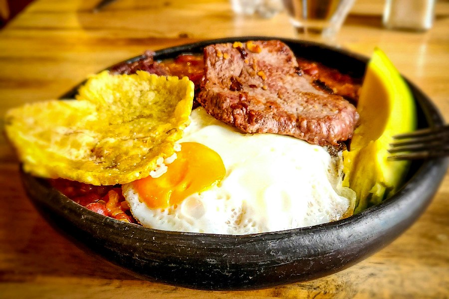 Bandeja paisa to kulinarna wizytówka mieszkańców Antioquii – potrawa o charakterze sycącego, rustykalnego dania, która pierwotnie miała zapewnić energię pracownikom fizycznym w górskich regionach Kolumbii. Współcześnie pozostaje jednym z najbardziej rozpoznawalnych dań kraju, serwowanym zarówno w tradycyjnych knajpkach, jak i w restauracjach fine-dining reinterpretujących klasykę kolumbijskiej kuchni. Talerz – zawsze duży, często wręcz półmisek – wypełnia się szeregiem składników, które razem tworzą harmonijną, choć intensywną kompozycję smaków. Podstawą są wolno gotowane frijoles cargamanto, kremowe fasole o głębokim aromacie, zwykle przyrządzane na wywarze z kości wieprzowych. Obok znajduje się mielona wołowina, smażona na złoto i doprawiona czosnkiem, cebulą oraz kolendrą. Kluczowym elementem jest chicharrón – chrupiący boczek z warstwą miękkiego mięsa pod skórką, będący jednym z najbardziej charakterystycznych akcentów bandeji. Na talerzu pojawia się także chorizo, jajko sadzone, porcja białego ryżu, dojrzałe awokado i niewielka arepa, która równoważy intensywność pozostałych składników. Całość uzupełnia smażony słodki plantan, wprowadzający subtelną, karmelową słodycz. Kompozycja nie jest przypadkowa – ma tworzyć pełnowartościowy, sycący posiłek, będący celebracją obfitości regionu.