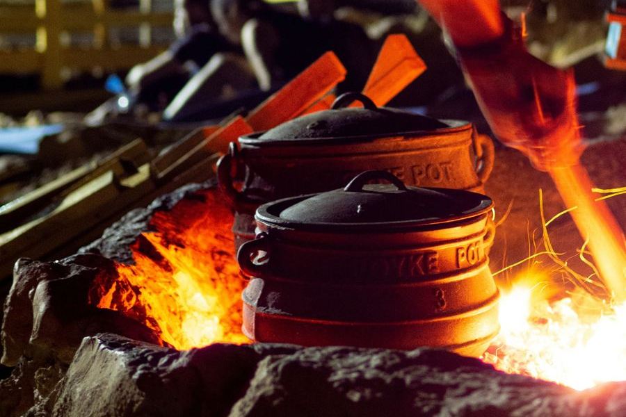 Potjiekos to powoli gotowany gulasz przygotowywany w żeliwnym garnku nad ogniem.