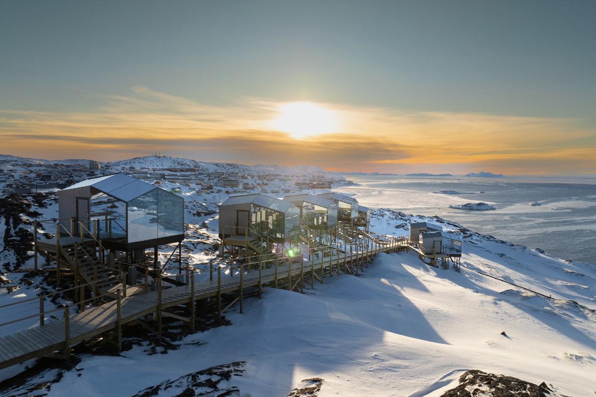- Aurora Cabin (25 m²) – liczba osób: maks. 2 dorosłych, łóżko podwójne, panoramiczne okna z widokiem na Zatokę Disko, prywatna łazienka, ogrzewane ściany i podłoga, sterowanie oświetleniem i ogrzewaniem, system audio Bluetooth, mini lodówka, zestaw do kawy i herbaty.