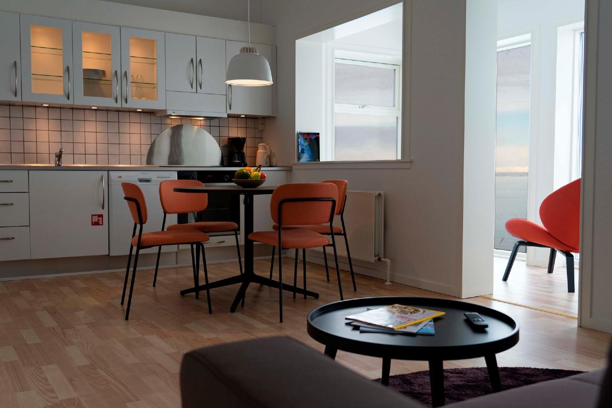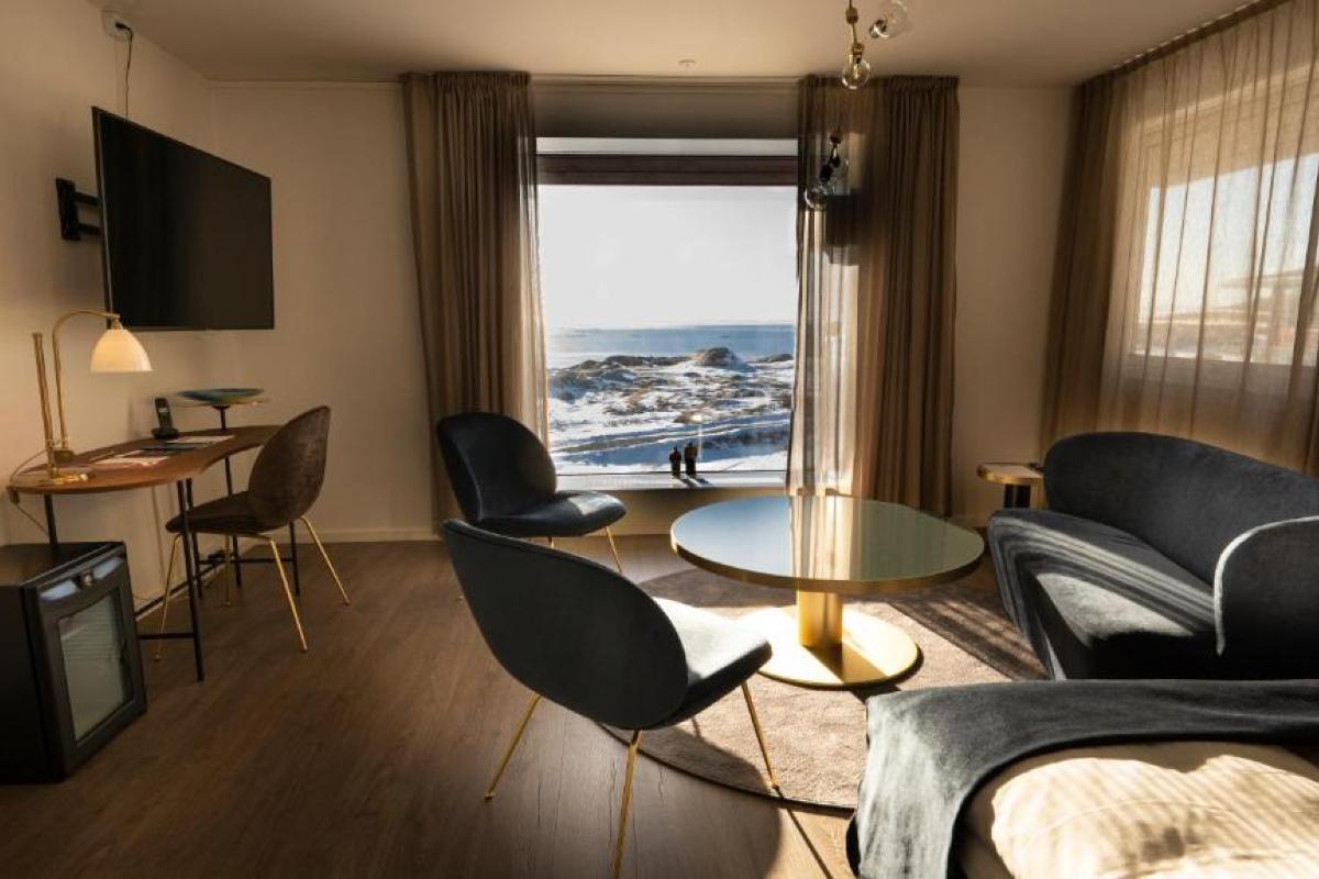- Junior Suite 4 (35 m²) – liczba osób: maks. 4 dorosłych lub 2 dorosłych + 2 dzieci, łóżko typu king-size lub dwa pojedyncze, widok na fiord lodowy i zatokę, sofa i fotel w części wypoczynkowej, łazienka z przeszklonym prysznicem, możliwość połączenia dwóch pokoi.
