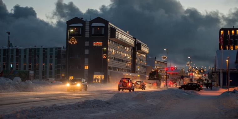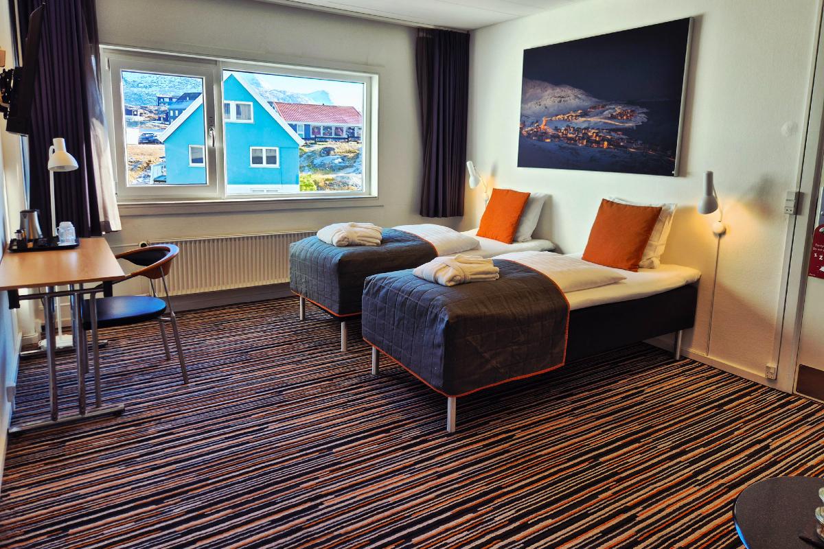 Hotel znajduje się w centrum Nuuk, w zasięgu krótkiego spaceru od nabrzeża oraz głównych punktów miasta, takich jak centrum kultury Katuaq czy Muzeum Narodowe. Dzięki położeniu przy głównej arterii miasta łatwo stąd dotrzeć do restauracji, sklepów i lokalnych atrakcji. Do lotniska w Nuuk dojazd zajmuje zwykle około 15–30 minut (w zależności od trasy i warunków).
