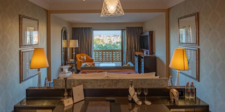 • Grande Heritage Lake View Room with Balcony (59 m²) – liczba osób: maks. 2 dorosłych, łóżko typu king-size, widok na jezioro i góry Aravalli, prywatny balkon.
