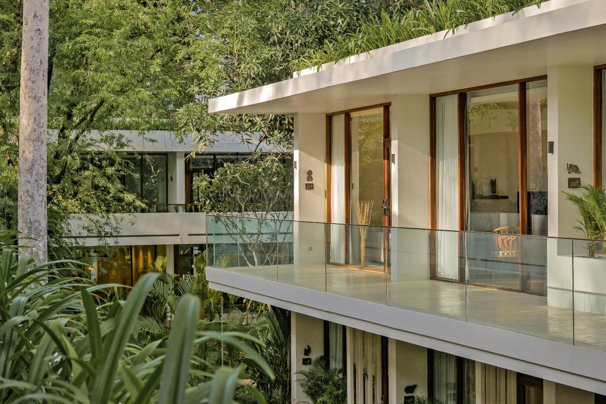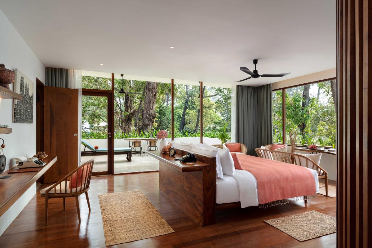 - River View Suite (149 m²) – liczba osób: maks. 3 dorosłych + dziecko, łóżko podwójne i część dzienna z sofą, narożne położenie z szeroką panoramą na rzekę Siem Reap, balkon lub taras z przestrzenią do wypoczynku i posiłków, minibar uzupełniany w ramach standardu apartamentu.