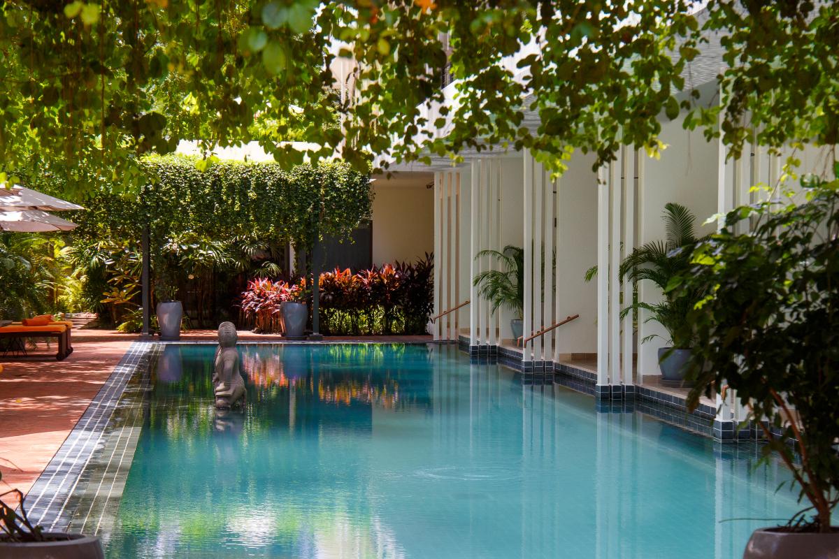 Hotel znajduje się w Starej Dzielnicy Francuskiej w Siem Reap, w sąsiedztwie terenów spacerowych i kluczowych punktów miasta. W okolicy są restauracje, kawiarnie i miejsca na wieczorne wyjścia, a jednocześnie sam obiekt pozostaje odseparowany od zgiełku dzięki dużemu ogrodowi. Do kompleksu Angkor Wat dojazd zajmuje zwykle około 15 minut samochodem. Do lotniska Siem Reap Angkor dojazd trwa około 45–60 minut.