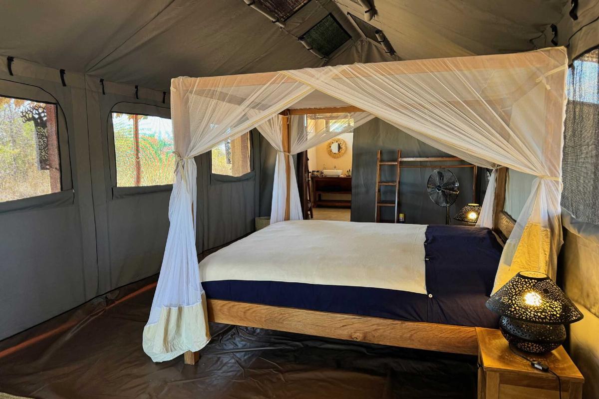 - Luxury Safari Tent (34 m²) – liczba osób: maks. 2 dorosłych, łóżko z baldachimem i moskitierą, widok na otaczającą przyrodę, prywatna zewnętrzna strefa wypoczynkowa, łazienka.