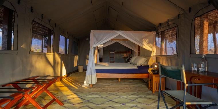 Namoroka Tsingy Camp oferuje dziewięć namiotów typu safari, które łączą przygodowy charakter pobytu z bardzo komfortowymi warunkami. Na wyposażeniu każdego namiotu znajdują się m.in. łóżko z baldachimem i moskitierą, łazienka z prysznicem, ciepła woda i energia elektryczna dostępna całą dobę, biurko, szafa oraz miejsce na bagaż. W 2026 roku obóz dysponuje 9 namiotami.