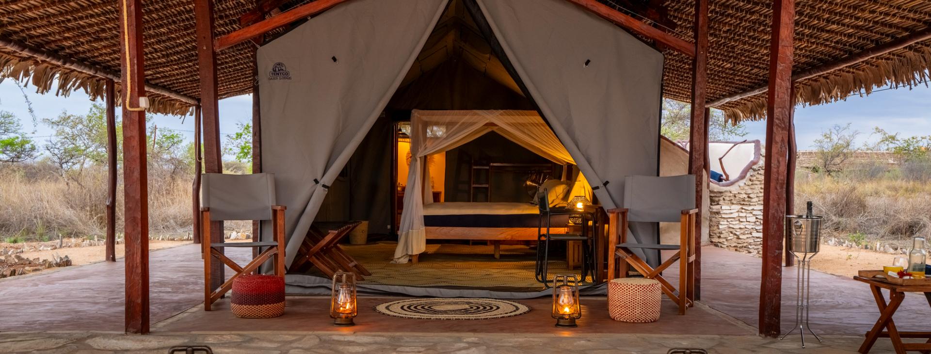 - Luxury Safari Tent (34 m²) – liczba osób: maks. 2 dorosłych, łóżko z baldachimem i moskitierą, widok na otaczającą przyrodę, prywatna zewnętrzna strefa wypoczynkowa, łazienka.
