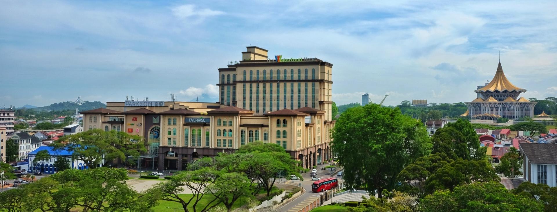 Usytuowany na górnych piętrach nowoczesnego centrum handlowego Plaza Merdeka pięciogwiazdkowy hotel The Waterfront oferuje jedne z najlepszych widoków w Kuching, bliskość turystycznych atrakcji i tętniącego życiem nadbrzeża. Tu także zlokalizowany jest jedyny most dla pieszych w mieście, który łączy brzegi i symbolizuje równowagę żyjących obok siebie kultur, a wieczorową porą zachwyca barwną iluminacją. Komfortowe pokoje zapewniają wygodny odpoczynek, restauracje – degustację lokalnych potraw, a hotelowa galeria sztuki przybliża miejscową kulturę i promuje młodych artystów. Goście mają do dyspozycji basen i siłownię.