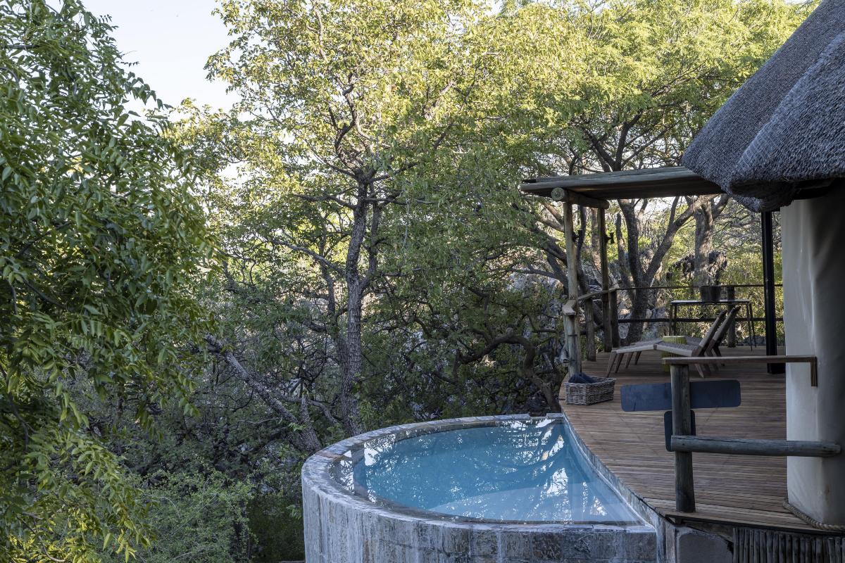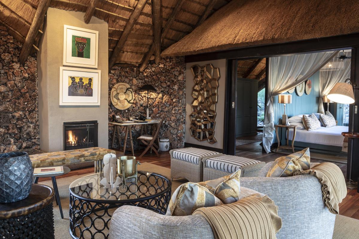 Lodge składa się z zaledwie trzech przestronnych willi zbudowanych z naturalnego kamienia, drewna i trzciny, w pełnej harmonii z otaczającą przyrodą. Każda z nich oferuje salon z kominkiem, klimatyzację, minibar, zestaw do parzenia kawy i herbaty, sejf, Wi-Fi, przestronną łazienkę z wanną i prysznicem wewnętrznym oraz zewnętrznym. Duże przesuwne drzwi prowadzą na taras z prywatnym basenem i częścią wypoczynkową, z której roztacza się widok na busz i wodopój.