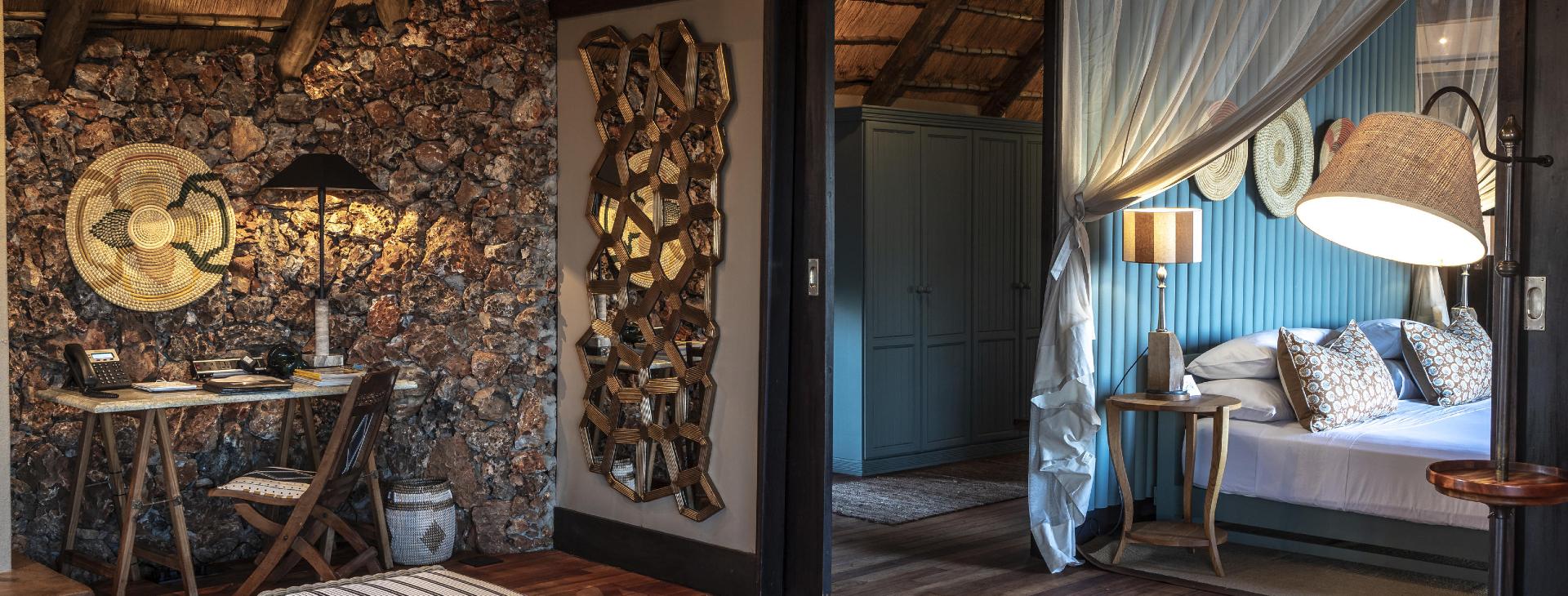 Lodge składa się z zaledwie trzech przestronnych willi zbudowanych z naturalnego kamienia, drewna i trzciny, w pełnej harmonii z otaczającą przyrodą. Każda z nich oferuje salon z kominkiem, klimatyzację, minibar, zestaw do parzenia kawy i herbaty, sejf, Wi-Fi, przestronną łazienkę z wanną i prysznicem wewnętrznym oraz zewnętrznym. Duże przesuwne drzwi prowadzą na taras z prywatnym basenem i częścią wypoczynkową, z której roztacza się widok na busz i wodopój.