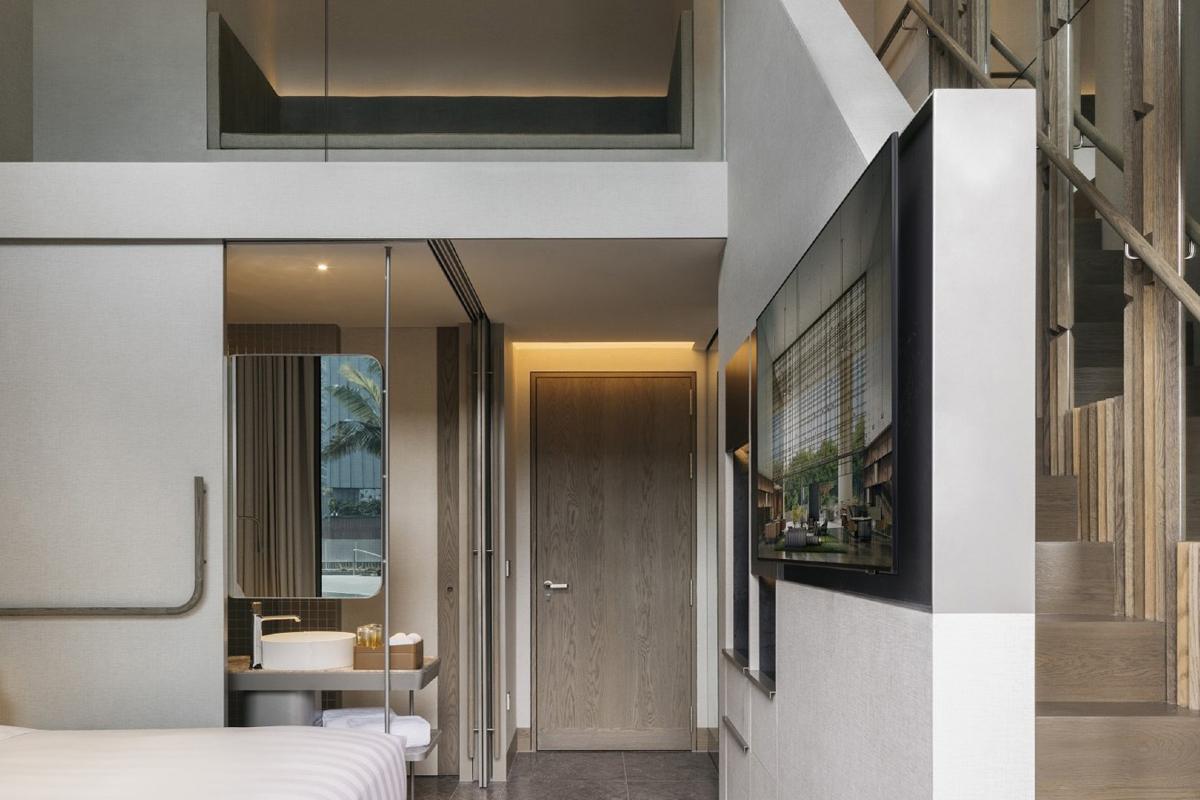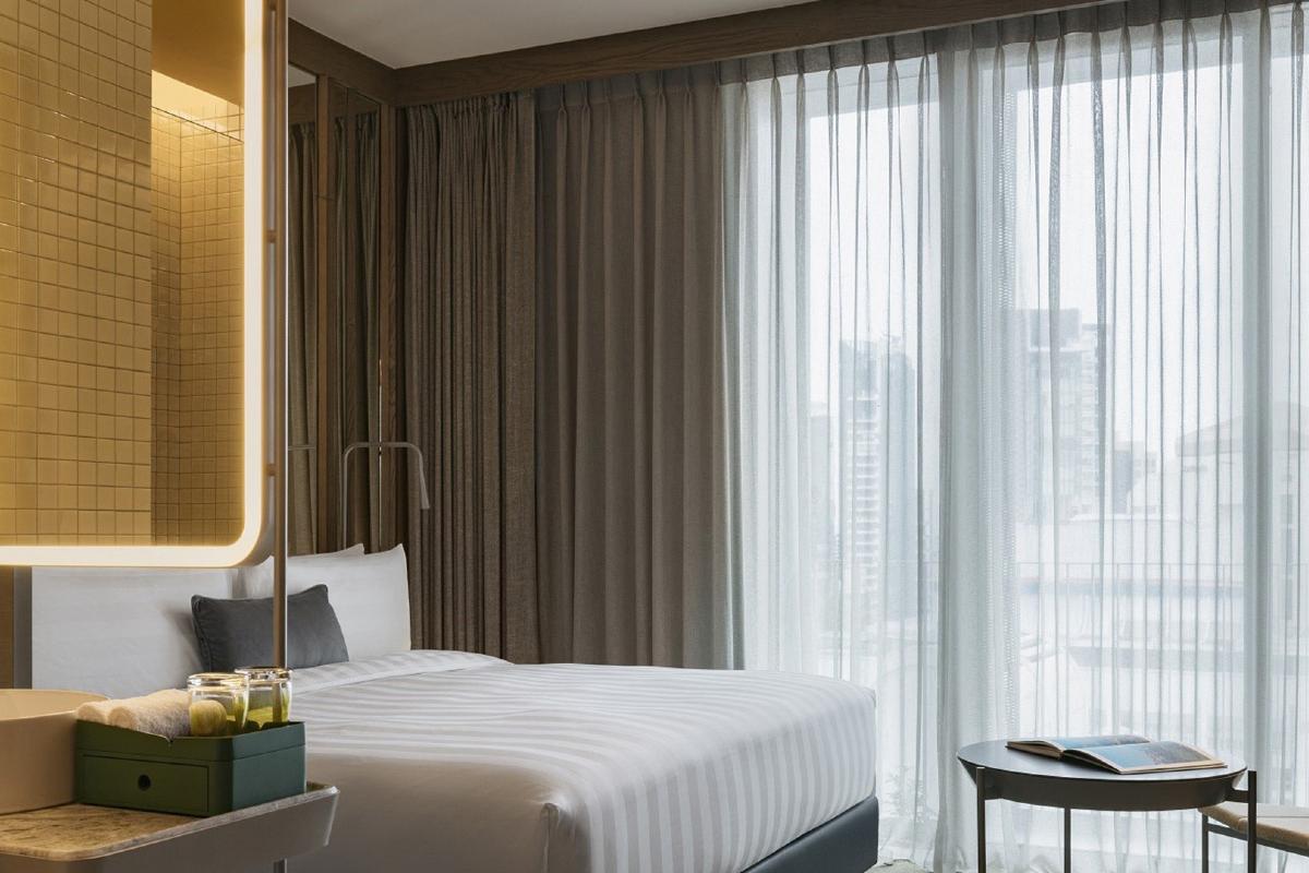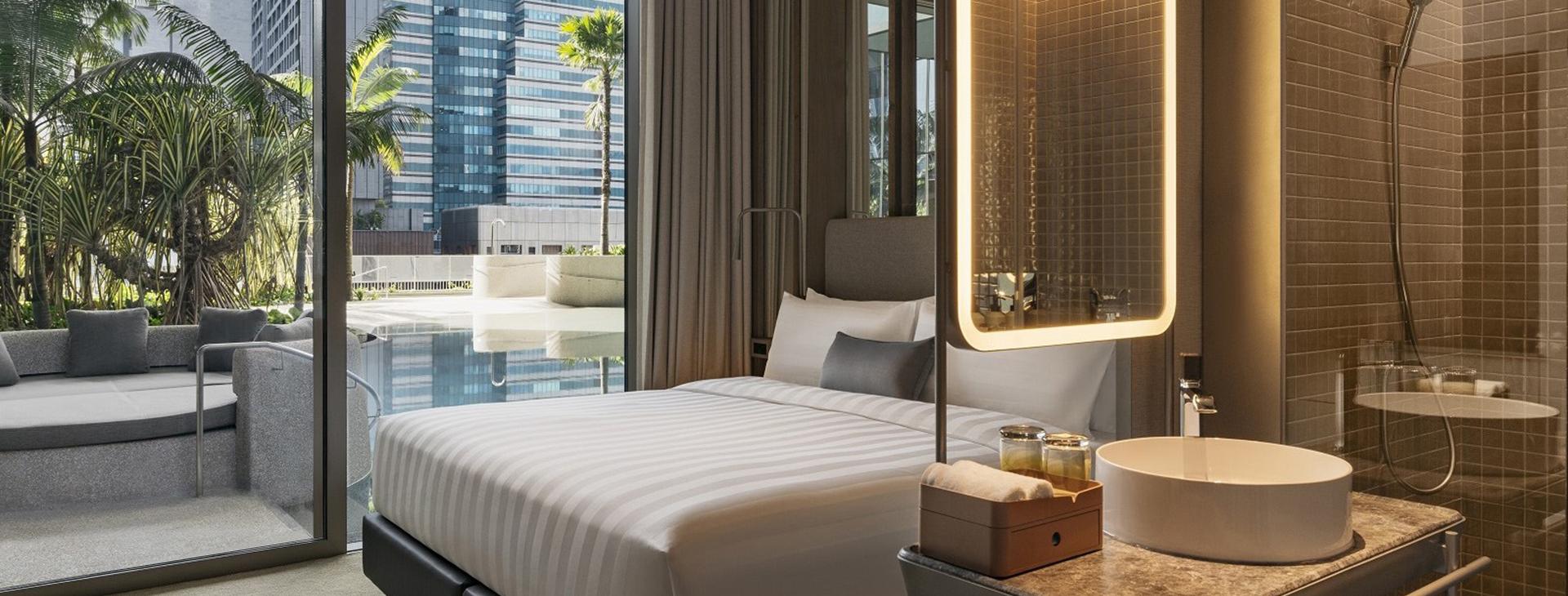 Hotel oferuje 347 pokoi i apartamentów, zaprojektowanych w nowoczesnym, minimalistycznym stylu z wyraźnym naciskiem na naturalne materiały, jasną kolorystykę i panoramiczne przeszklenia. Wnętrza są funkcjonalne i doskonale doświetlone, a widoki obejmują panoramę miasta lub zielone tarasy hotelu. Standardowe wyposażenie obejmuje klimatyzację, telewizor, minibar, sejf, ekspres do kawy, zestaw do parzenia herbaty, suszarkę do włosów, Wi-Fi oraz łazienkę z prysznicem typu walk-in.
