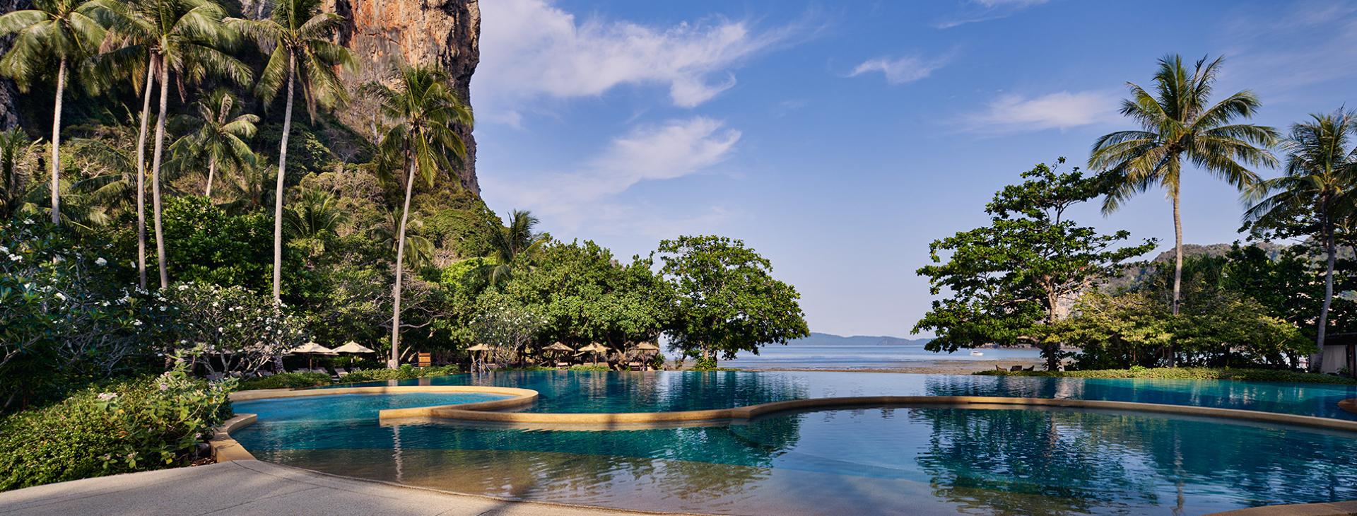 Rayavadee to pięciogwiazdkowy hotel o niepowtarzalnym charakterze, położony w samym sercu Narodowego Parku morskiego Krabi. Otoczony trzema plażami i majestatycznymi wapiennymi klifami, stanowi esencję egzotycznego raju. Architektura inspirowana tradycyjnymi tajskimi wioskami harmonijnie współgra z otaczającą przyrodą, a dbałość o każdy detal sprawia, że pobyt tutaj to doświadczenie wyjątkowe — zarówno dla par szukających romantycznej ucieczki, jak i rodzin pragnących spokojnego wypoczynku w otoczeniu natury.