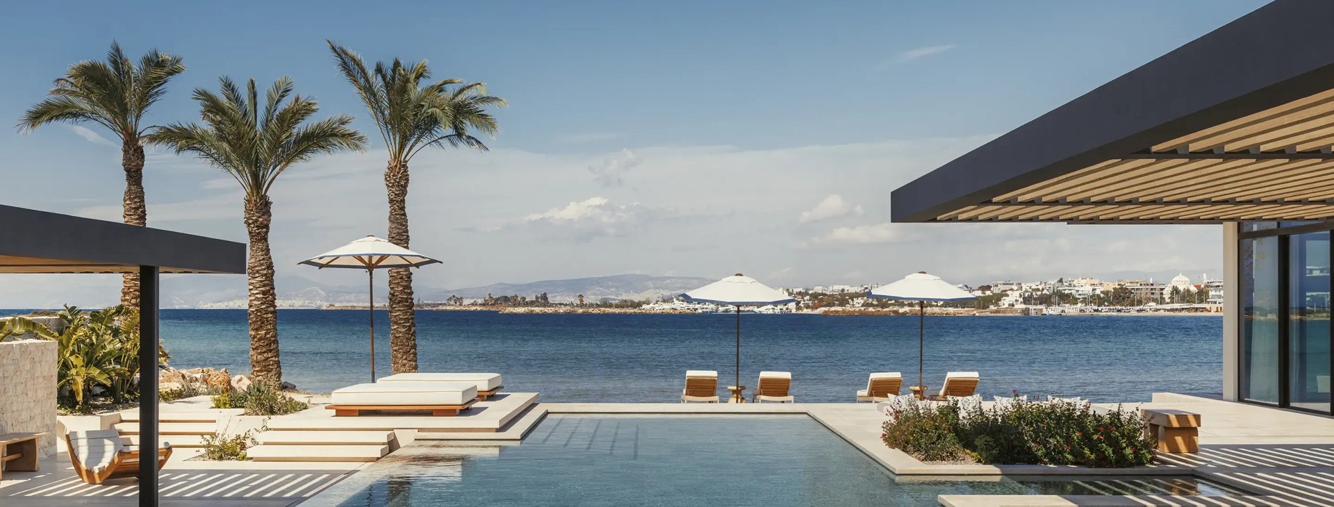 - Two-Bedroom Epos Residence – Seafront (179 m²) – liczba osób: maks. 4 dorosłych i dziecko, dwie sypialnie z łóżkiem typu king i dwoma łóżkami typu queen, dwie łazienki z wanną i oddzielnym prysznicem, salon, w pełni wyposażona kuchnia, jadalnia, umeblowany taras, basen, prysznic zewnętrzny, widok na morze.