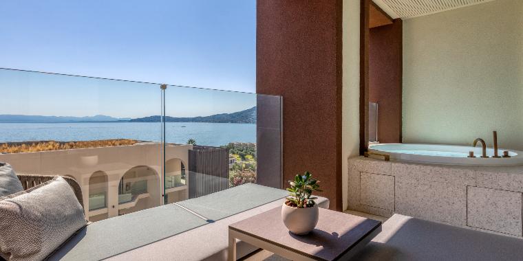 - Pavillon Suite (55 m2) – liczba osób: maks. 3, widok na morze, duże łóżko dwuosobowe, wanna lub prysznic, część wypoczynkowa, taras z zewnętrznym jacuzzi, prywatny basen.